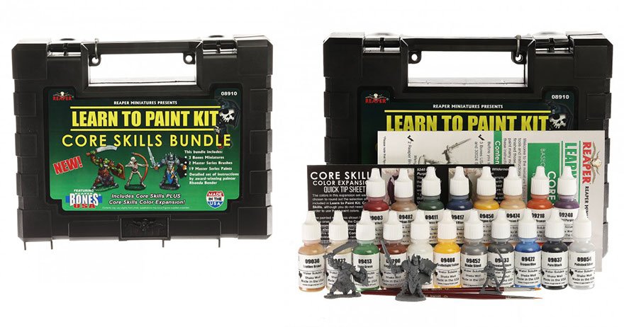 Learn to Paint Kit: Core Skills Bundle includes everything you need to start painting, including: 19 1/4 oz Starter Bottles MSP Core Colors and MSP Bones Ultra-Coverage paints, 2 MSP Paint Brushes, 3 Bones Miniatures, 1 Easy to follow Instruction Guide by award-winning painter Rhonda Bender.
